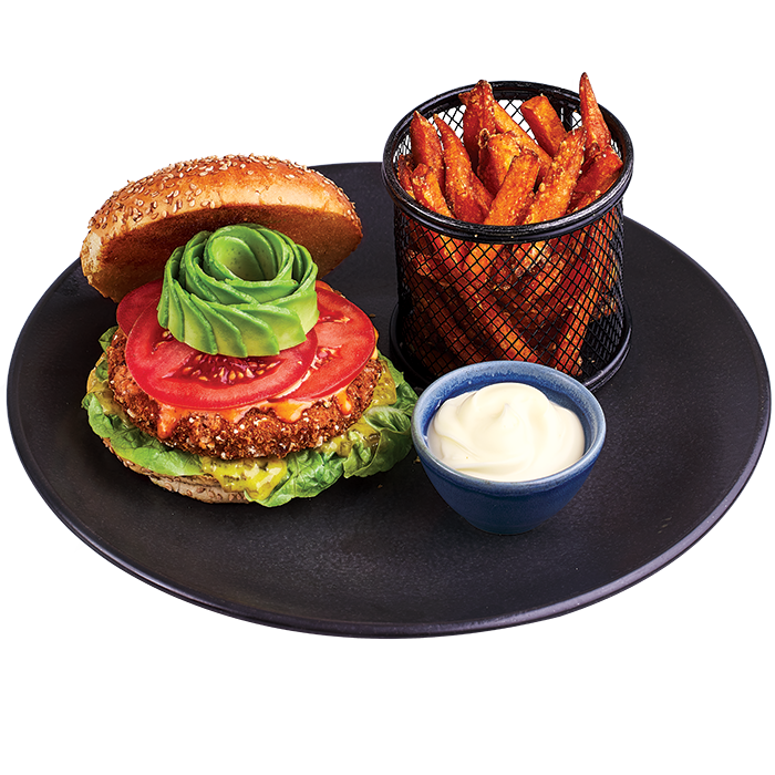 A crispy avocado, corn & quinoa burger with mustard relish, little gem lettuce, tomato and chipotle mayo on a vegan brioche bun with a side of our delicious Sweety Fries and vegan mayo.
