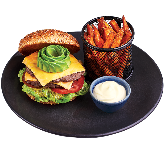 Two smashed-thin premium beef patties, with avocado, melted cheese, lettuce, tomato and mustard relish on a brioche bun. Served with a side of Sweety Fries and mayo.